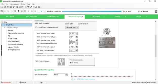 В каждом меню имеются графические изображения функций, помогающие понять назначение переменных и выполнить правильную последовательность настройки. На рисунке 2 показаны примеры визуализации параметрирования ПЧ с помощью вкладки «Parameters Layout» ПО SoMove.