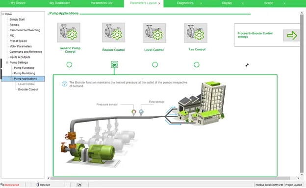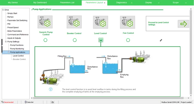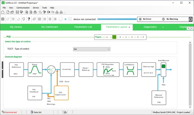 В большинстве современных преобразователей частоты (ПЧ) функции регулирования скорости электродвигателя, защиты и мониторинга дополняются функциями автоматизированной системы управления (АСУ). Например, в ПЧ могут быть реализованы функциями АСУ такие как замкнутая система управления технологическим параметром с ПИД-регулятором или АСУ насосной станции с каскадным пуском насосов. Настройка таких ПЧ может быть значительно упрощена, если использовать наглядное графическое представление системы. Программное обеспечение (ПО) SoMove компании Schneider Electric обеспечивает такую возможность для ПЧ Altivar Process ATV600, ATV900 и Altivar Machine ATV340. Набор инструментов и мнемосхем располагается во вкладке «Parameters Layout» ПО (рисунок 1).