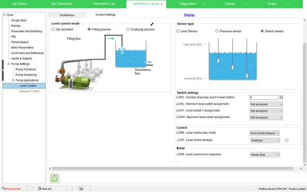 Меню «Настройка насоса» вкладки «Parameters Layout» ПО SoMove для ПЧ ATV600 содержит подменю «Функции насоса» (Pump Function), «Мониторинг насоса» (Pump Monitoring) и «Насосное применение» (Pump Application). Данные подменю содержат мнемонические схемы и графики, на которых наглядно показано влияние выбранных параметров при настройке функций защиты насосных агрегатов, их мониторинга и настройки для применения ПЧ в системах водоснабжения с поддержанием давления (рисунок 5) и в системах водоотведения с поддержаним необходимого уровня жидкости в резервуаре (рисунок 6).