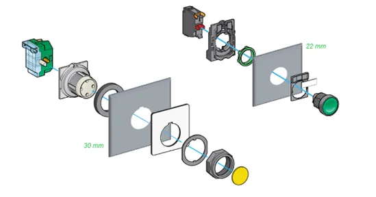 На сегодняшний день основным стандартом для кнопок является диаметр 22 мм и монтаж на лицевую сторону шкафа. Но также распространены кнопки, которые устанавливаются в отверстия диаметром 30 мм с задней стороны шкафа, и этот способ имеет несколько преимуществ.