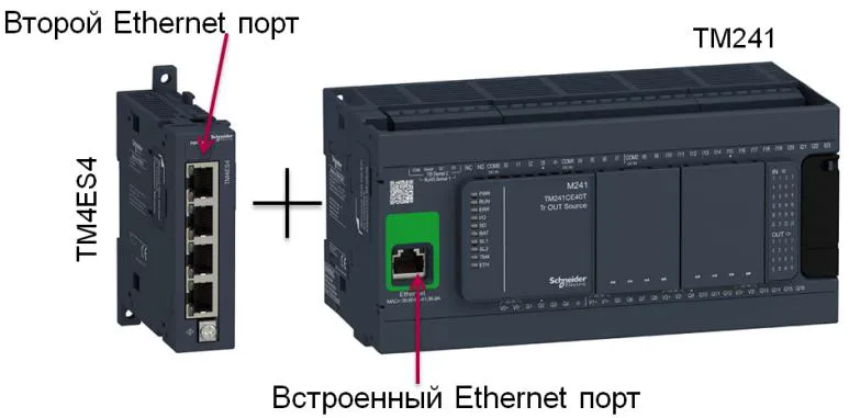 3) Возможность использования 2-х Ethernet портов на всех версиях контроллера M241 для расширения функционала встроенного Ethernet порта для управления полевой периферией по протоколам Modbus TCP и EthernetIP; поддержка конфигуратора каналов обмена IOscanner.