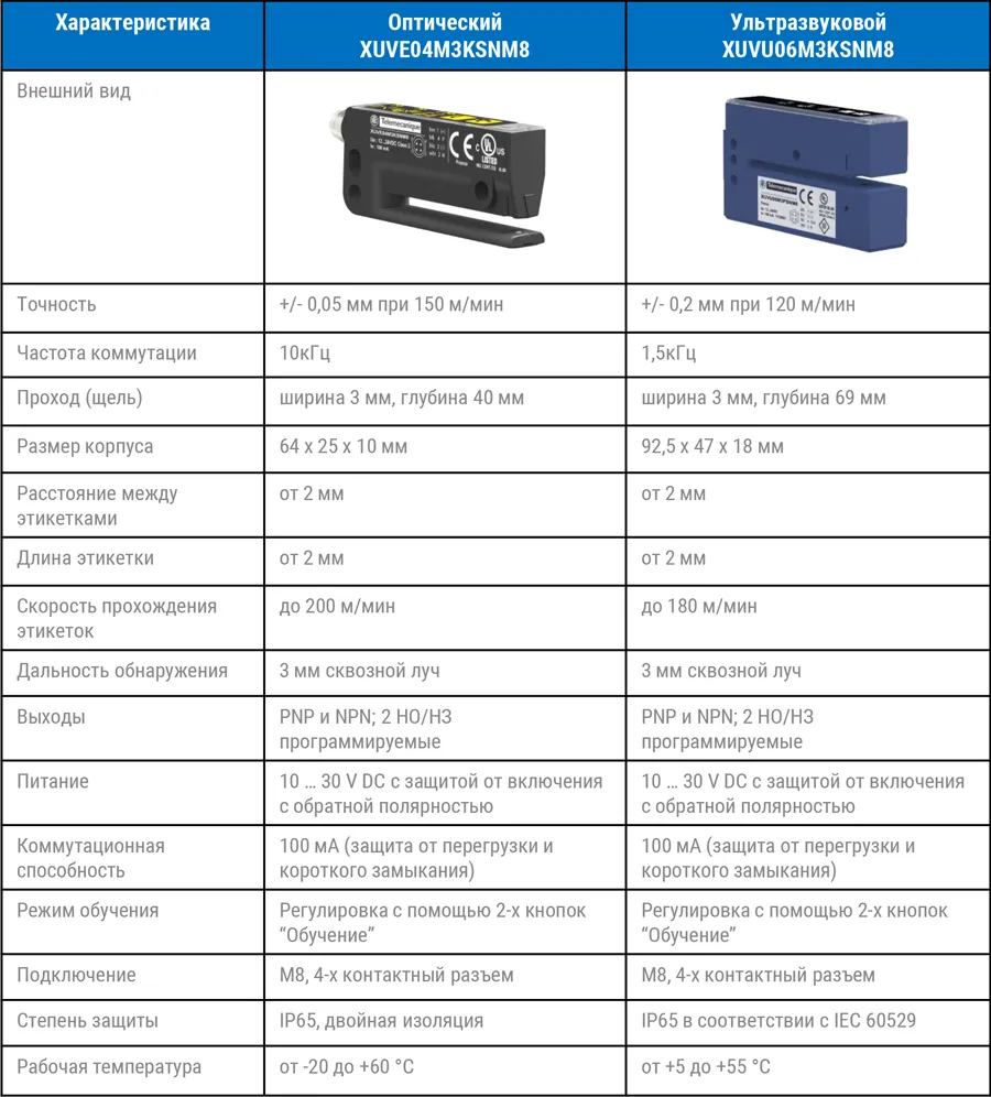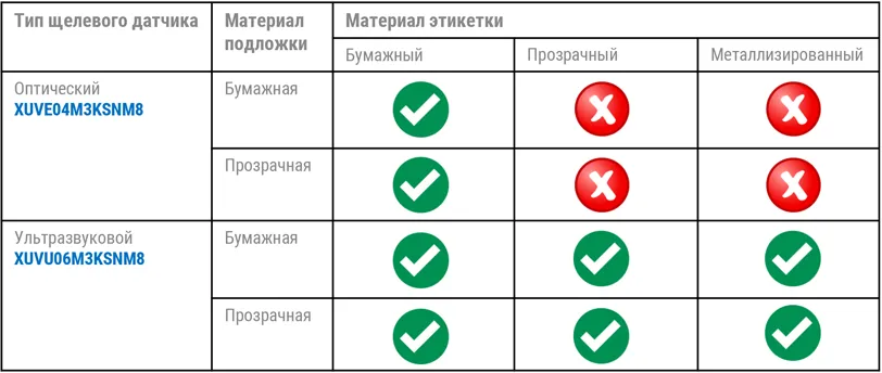 Датчики XUVU06M3KSNM8 и XUVE04M3KSNM8 отличаются принципом действия - первый использует ультразвуковой излучатель, а второй – оптический. Датчик выбирается в зависимости от того, с каким материалом этикетки и подложки необходимо работать (см. таблицу). Таким образом датчик XUVE04M3KSNM8 будет оптимален для работы с непрозрачными этикетками, а XUVU06M3KSNM8для работы со сложными прозрачными или металлизированными. Ещё одной важной отличительной особенностью УЗ- датчика является его способность работать в сложных условиях – наличие взвеси, пыли в окружающем воздухе. Таблица ниже позволяет наглядно сравнить основные технические характеристики двух типов датчика.