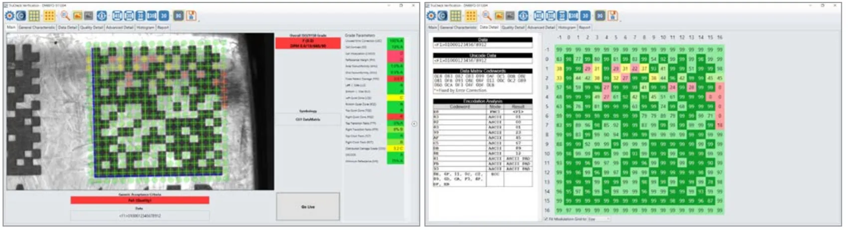 Высокоскоростное определение местоположения кода и его декодирования в сочетании с надежными алгоритмами гарантирует повторяемость результатов считывания. Что в свою очередь обеспечивает быстрое и точное выполнение операций на производственных линиях. Подробные отчеты верификации качества отражают соответствие кодов стандартам ISO/IEC и могут быть использованы для аудита, контроля процесса печати маркировки.