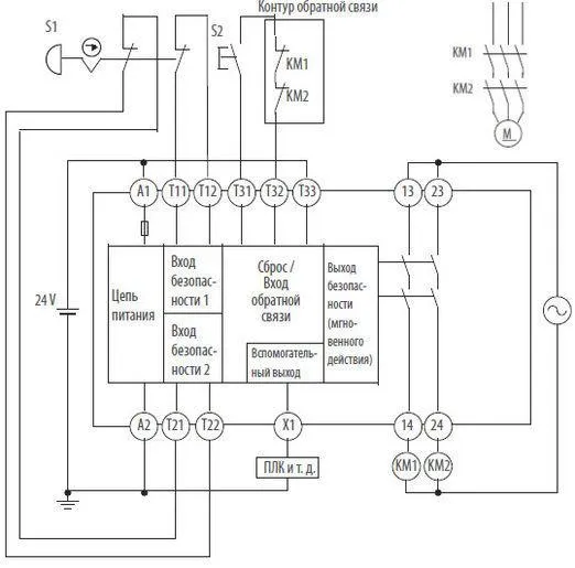 Выход реле безопасности дублируется, а также имеет вспомогательный выход, который можно использовать для контроля состояния системы, если сигнал транслировать на ПЛК. Вспомогательный выход не дублируется и не включен в основную цепь системы безопасности.