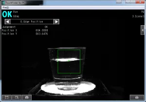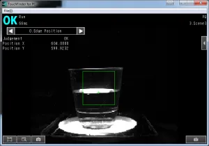 Переведя камеру в рабочий режим Run – > Switch to Run mode и увеличивая/уменьшая количество жидкости в стакане, мы можем наблюдать изменение координаты кромки жидкости по оси Y.