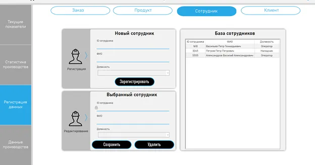 В начале смены сотрудник прикладывает к считывателю карточку, на которую записан его ID. Посылается запрос в Базу Данных и на HMI панели SE HMIST6500 отображаются данные этого сотрудника. Далее для того, чтобы войти в систему, сотрудник на HMI выбирает тип взаимодействия с машиной (по типу взаимодействия устанавливается, что с машиной происходит в текущий момент времени – работа, простой, наладка или сервисное обслуживание). Далее сотрудник вводит номер заказа и нажимает кнопку «Начать смену». После нажатия кнопки «Начать смену» машина может быть запущена. До этого пуск машины блокируется.