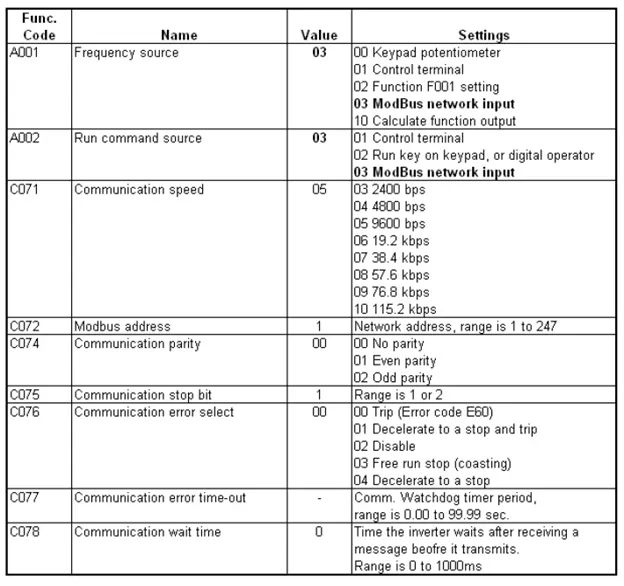 По умолчанию MX2 настроен для приема задания скорости и запускает командные сигналы от встроенной клавиатуры передней панели и внешних цифровых входных сигналов. Для того, чтобы MX2 полностью управлялся через Modbus, изменим следующие параметры (см. Рис 6) преобразователя частоты через его переднюю панель. Обязательно перезагрузите ПЧ, чтобы изменения вступили в силу.