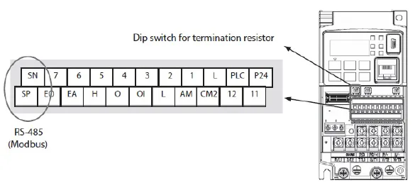 Преобразователь MX2 будет полностью управляться командами Modbus по последовательной линий связи RS485, поэтому не требуется дополнительная проводка ввода/вывода. Проводка коммуникационной связи подключается к клеммам «SN» и «SP» преобразователя частоты MX2 и винтовым клеммам модуля связи CP1W-CIF11.