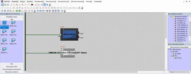 Для организации связи между программируемым логическим контроллером Omron CP1L-E и HMI Omron NB7 по каналу Ethernet воспользуемся программным обеспечением NB-Designer от компании Omron. Из списка слева выберем используемые нами панель оператора (HMI) и ПЛК. Интерфейс связи выбираем Ethernet. (Рис.1)