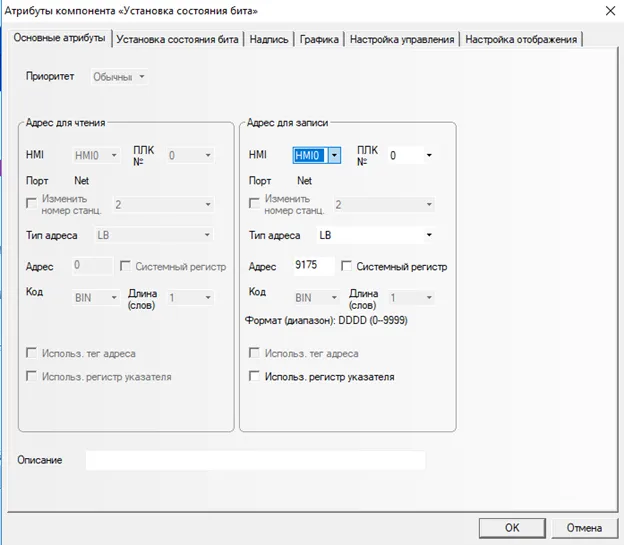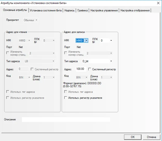 Добавим кнопку запуска двигателя. Из бокового меню выберем: Компоненты ПЛК→Установка состояния бита. В параметрах укажем тип адреса: D_bit, адрес: 100.00 (Рис. 11).