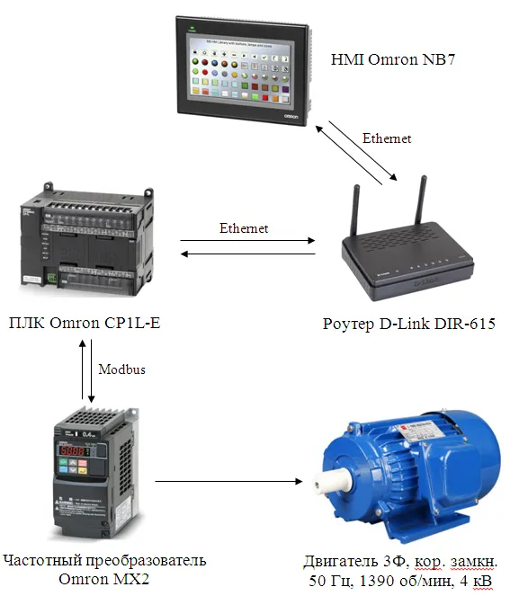 В приведенном ниже примере используется ПЛК CP1L-E от компании Omron с дополнительным последовательным модулем CP1W-CIF11 для связи с преобразователем частоты MX2 по сети Modbus. Это позволит нам реализовать такие функции, как запуск/останов двигателя, контроль скорости, мониторинг состояния, а также сброс ошибок.