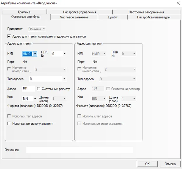 Добавим поле ввода данных частоты вращения двигателя. Из бокового меню выберем: Компоненты ПЛК → Ввод числа. В параметрах укажем тип адреса: D, адрес: 101 (Рис. 12).