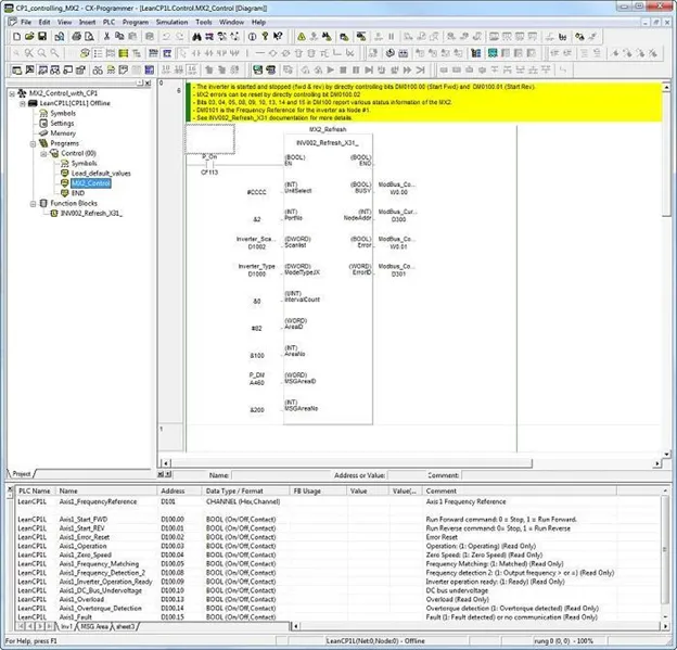 Программа ПЛК полностью закомментирована для легкого понимания функциональности и работы (Рис. 8).Она включает функциональный блок, который обеспечивает контроль и мониторинг ПЧ MX2 с использованием протокола Modbus.