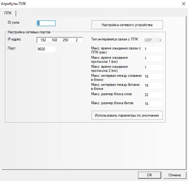 В параметрах ПЛК указываем: IP-адрес: 192.168.250.2; Порт: 9600; ID узла:2 (Рис. 3)